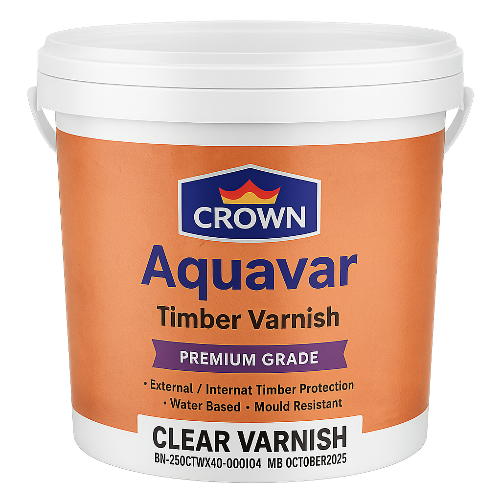Crown Aquavar Clear Timber Varnish – Water-based, mould-resistant, and ideal for both interior and exterior wood.